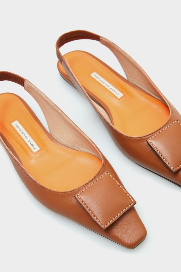 Zapato plano destalonado en piel de napa con detalle de cubo con acolchado Pop y pespuntes a contraste. Tira elástica al talón y plantilla de piel a contraste.