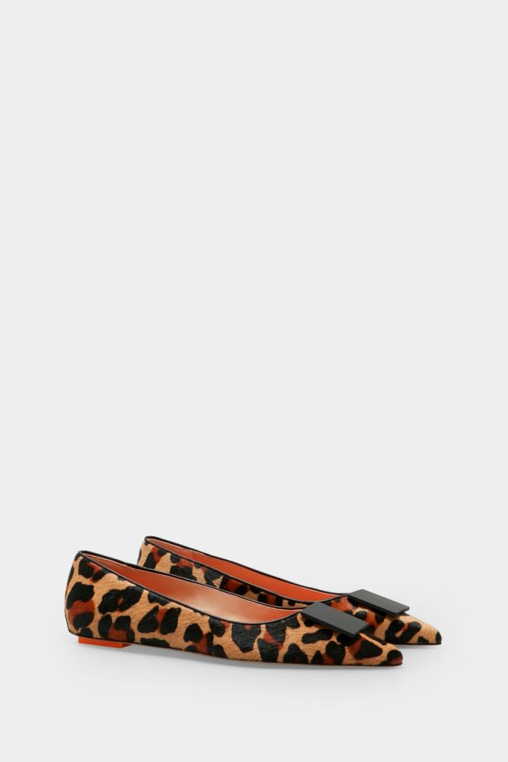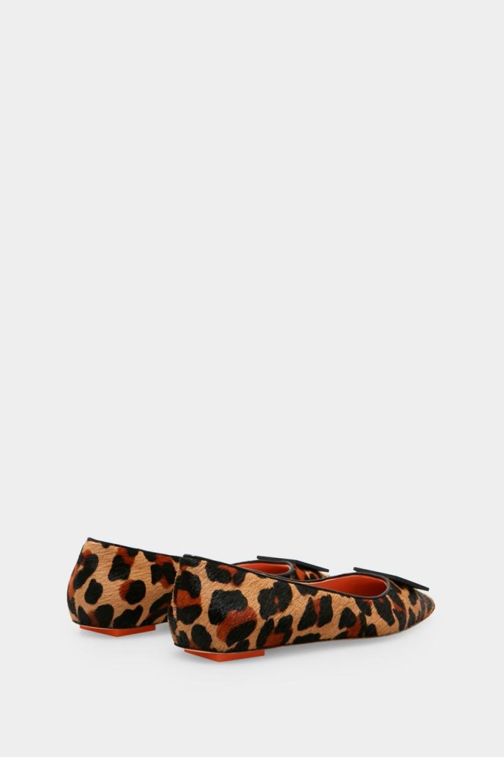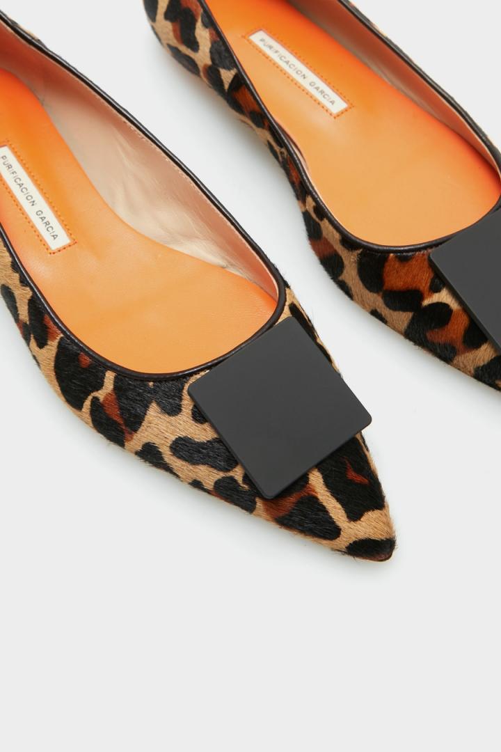 Zapato plano en piel con acabado de pelo con estampado de leopardo. Chapón en forma de cubo a contraste. Suela en piel y plantilla de piel a contraste.